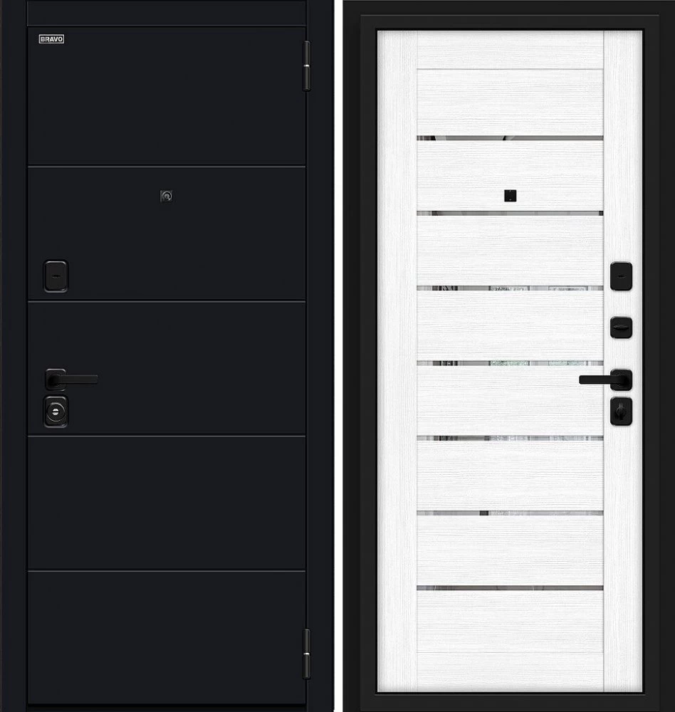 Надежная входная Дверь Браво Прайд Total Black/Snow Melinga премиум класса по цене 41 280 руб. Большая толщина стали защитит от проникновения в ваш дом, квартиру или коттедж. Используется очень качественная фурнитура: замки, цилиндры, ручки, защелки. Покрытие и отделка двери изготовлено под внимательным контролем производителя. Дверь имеет долгий срок службы и гарантию.