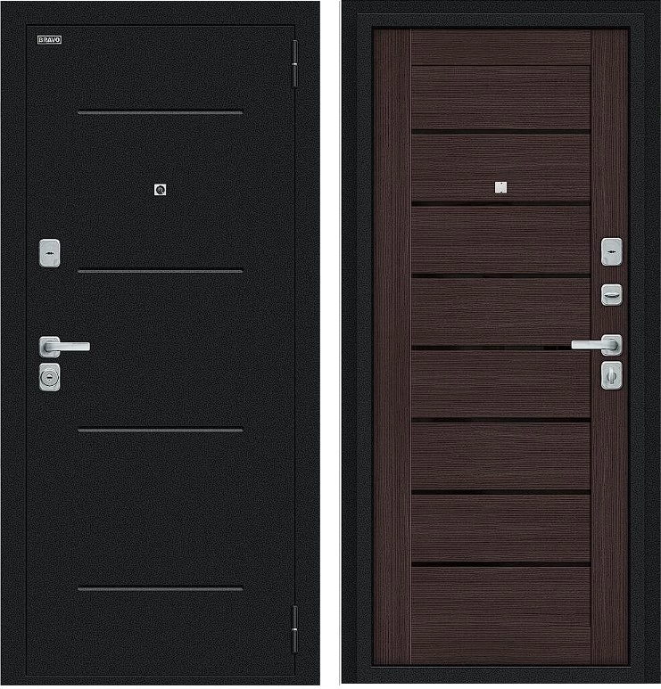 Надежная входная Дверь Браво Техно/BChrome Букле черное/Wenge Melinga премиум класса по цене 36 430 руб. Большая толщина стали защитит от проникновения в ваш дом, квартиру или коттедж. Используется очень качественная фурнитура: замки, цилиндры, ручки, защелки. Покрытие и отделка двери изготовлено под внимательным контролем производителя. Дверь имеет долгий срок службы и гарантию.